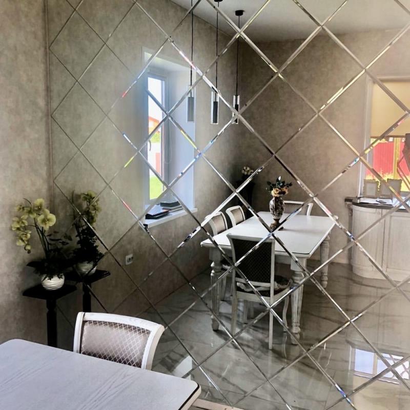 Зеркально панно было сделано из зеркальной плитки 30х30 см, размер панно 255х255 см