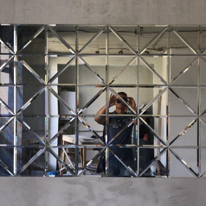 Это зеркальное панно примечательно несколькими моментами. Во-первых, его расположением. Панно удачно висит напротив широкого проема, ведущего в соседнюю комнату. Благодаря этому, пространство, отражающееся в зеркале, становится еще более глубоким, а значит, сильно меняется и пространственное восприятие помещения в целом.